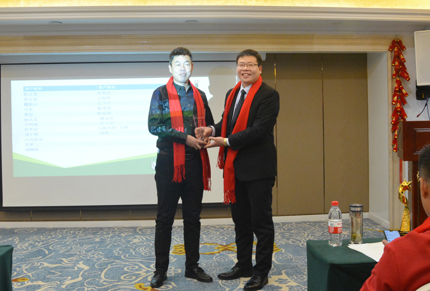 銷售經理宣布了2018年優秀經銷商得獎人名單,董事長、總經理為各位得獎嘉賓頒獎。